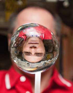 NASA astronaut Kevin Ford, Expedition 34 commander, watches a water bubble float freely between him and the camera.