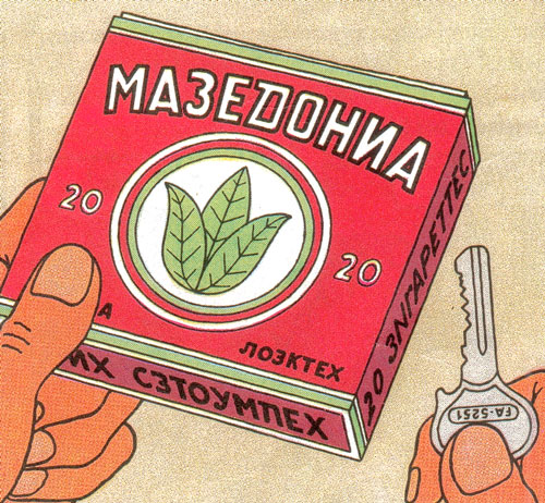 A full-sized, fold-up pattern for a package of Macedonia Cigarettes, as seen in The Calculus Affair, ready to color. The file is pdf format, compressed with zip. Download pdf file macecig.zip.