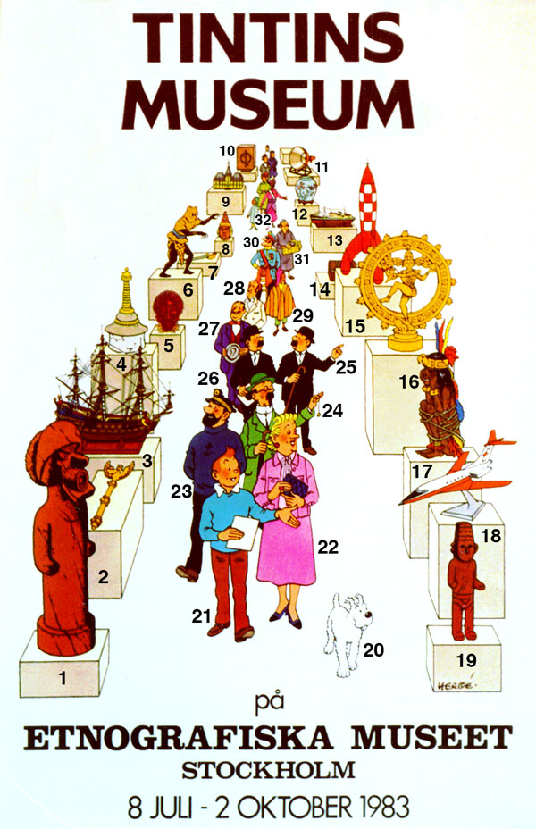 I first saw this poster, from the Museum of Ethnography in Stockholm, in a friend’s apartment and photographed it. The same image was also used on the cover of a book, Le Musee Imaginaire de Tintin, translated into English as Tintins Museum. I’ve used a scan of the book here for the image. Can you name all of the exhibits and people?
